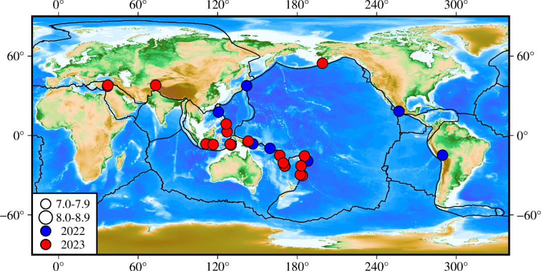 2022年和2023年全球7级以上地震分布图