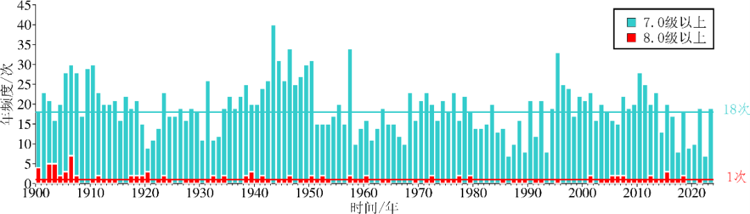 2023年全球未发生8级以上地震,最近一次为2021年7月29日美国阿拉斯加以南海域8.1级地震。2023年全球发生7级以上地震19次,与1900年以来年均频次(18次)基本持平,显著高于2022年7级以上地震的活动水平(7次)。