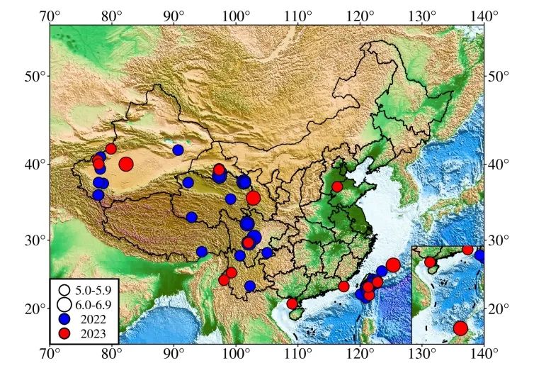 2022年和2023年我国5级以上地震分布图