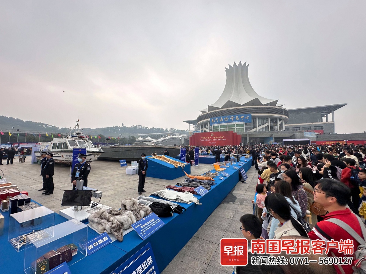 当天活动中,成果实物展区也围满了观展的市民。该展区展示有老虎皮、鳄鱼皮、水貂皮等走私违法犯罪实物,以及毒品、电信诈骗实物等等。