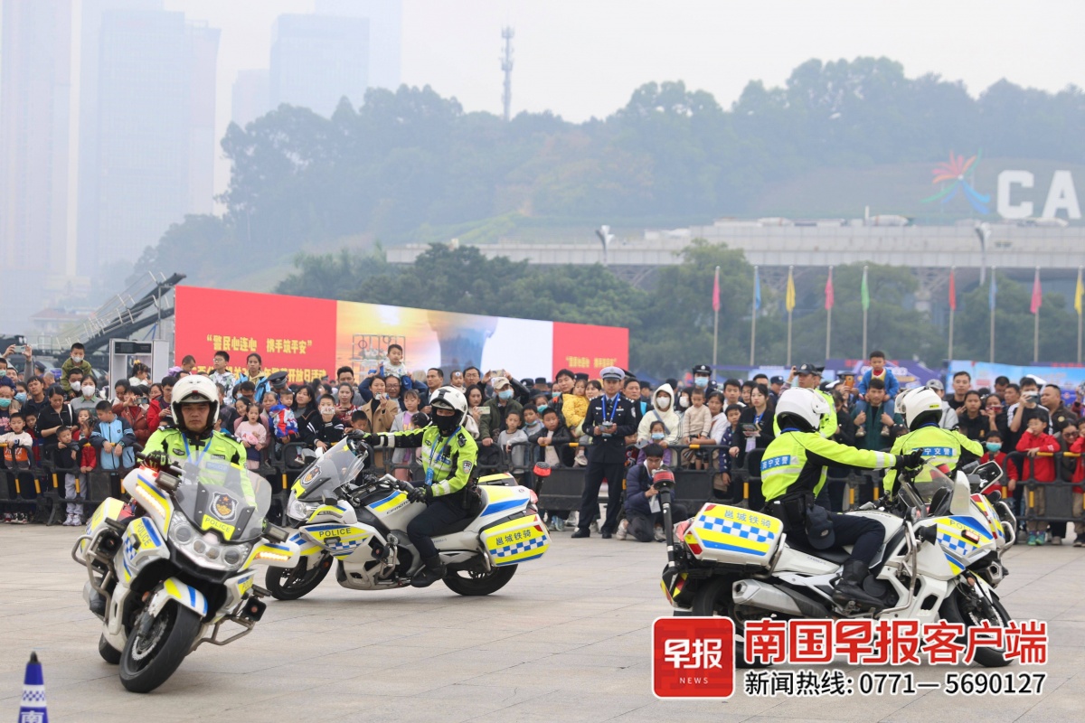 10时30分许,南宁交警铁骑队伴随着激昂的音乐有序出发,8字绕桩、压弯等一系列铁骑表演整齐而丝滑,引得现场掌声不断。