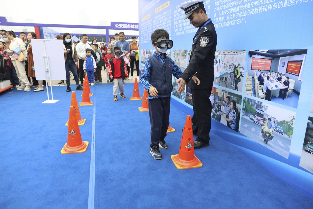 “视觉都是颠倒的,很晕。”在交通安全展台,覃女士戴着眼镜体验了酒驾,让她深刻地感受到酒后驾驶的危害。在110服务展台前,南宁蓝盾应急心理救援中心的工作人员现场教学海姆立克急救法,也吸引了很多市民围观学习。