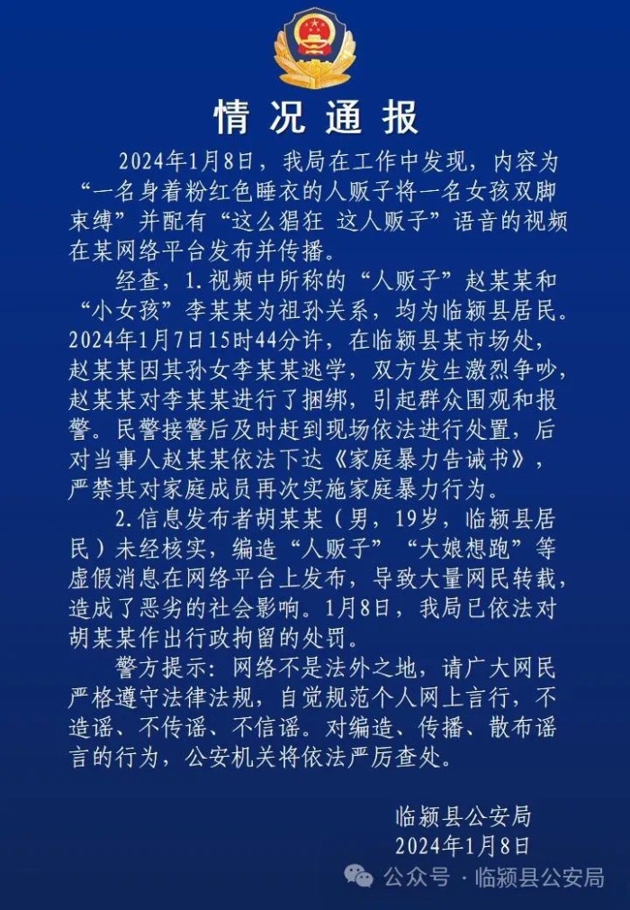 大皖新闻记者注意到,1月8日晚上,漯河市临颍县公安局发布情况通报称,1月8日,该局在工作中发现,内容为"一名身着粉红色睡衣的人贩子将一名女孩双脚束缚"并配有"这么猖狂这人贩子"语音的视频在某网络平台发布并传播。