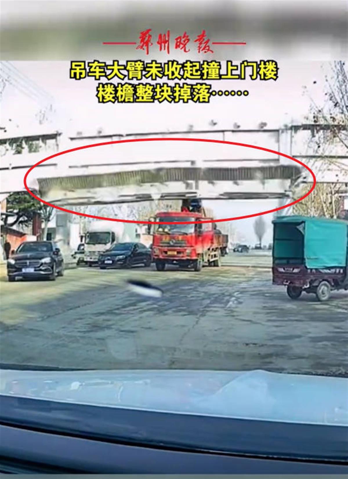 1月10日,河南周口太康县,一辆货车的装卸臂撞上门楼,楼檐瞬间掉落砸中车身。11日,当地镇政府工作人员回应极目新闻(报料邮箱:jimu1701@163.com)记者称,被撞门楼非文物,伤者已及时送医治疗,无生命危险。
