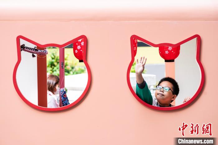 图为一名小朋友在“招财猫”布景处玩耍。 中新网记者侯宇摄