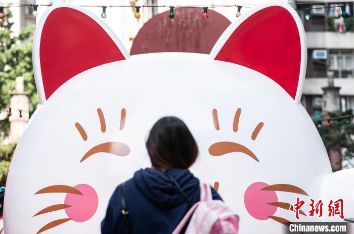 图为市民在巨型“招财猫”雕塑前驻足观赏。 中新网记者侯宇摄
