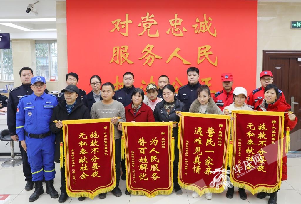 1月12日,张莉一家向鱼洞派出所、巴望救援队、鱼洞街道、巴南区蓝天救援队赠送锦旗。华龙网记者张质摄