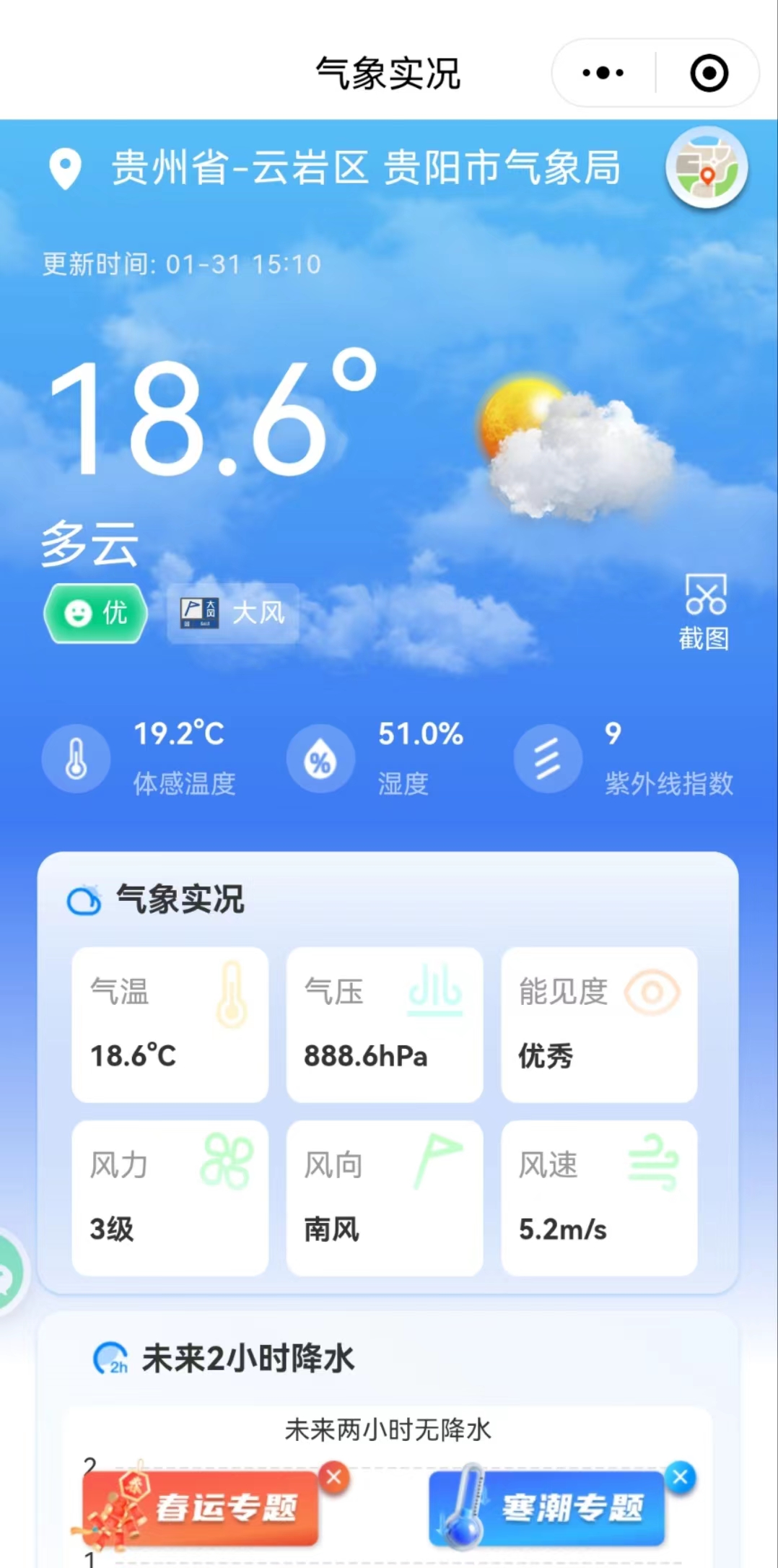 预计2024年2月贵阳贵安气温总体较常年偏高,但仍需关注阶段性降温以及低能见度天气带来的不利影响,同时提醒公众注意适时添衣保暖,取暖时注意用电用火安全。