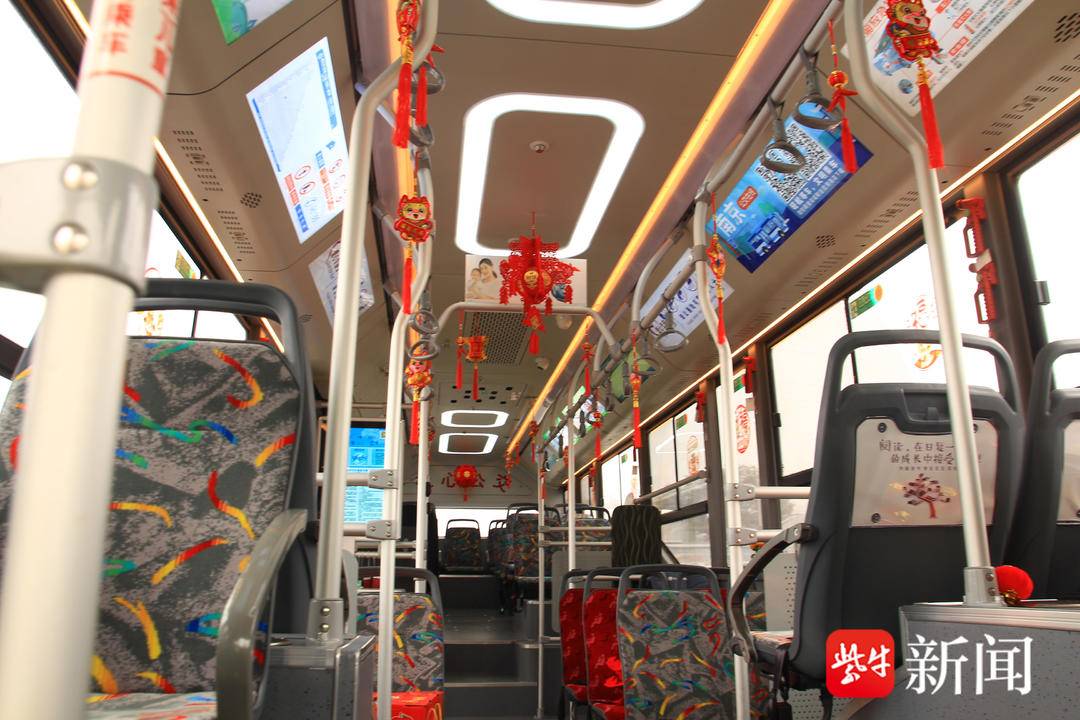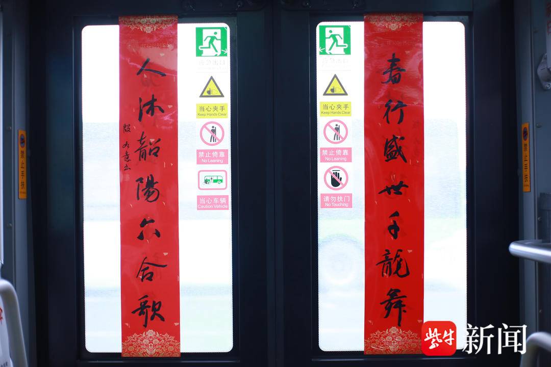 “客盈紫气龙蟠地,车载春风虎踞城”“钟山春鼓唱强富,东路龙图向建康”……不仅外观吸睛,车厢里也充满了“年味儿”。车门上张贴了中国书法家协会主席、江苏省书法家协会主席孙晓云和江苏省文化馆馆长、江苏省非物质文化遗产保护中心主任赵彦国书写的“福”字,以及南京诗词学会创作,江苏省书法家协会会员、南京市书法家协会理事、南京江北新区书法家协会副主席殷如意书写的楹联,车窗上张贴了龙年新春窗花,整个车厢充满喜悦,文化“年味”别样浓,对市民充满美好祝福。