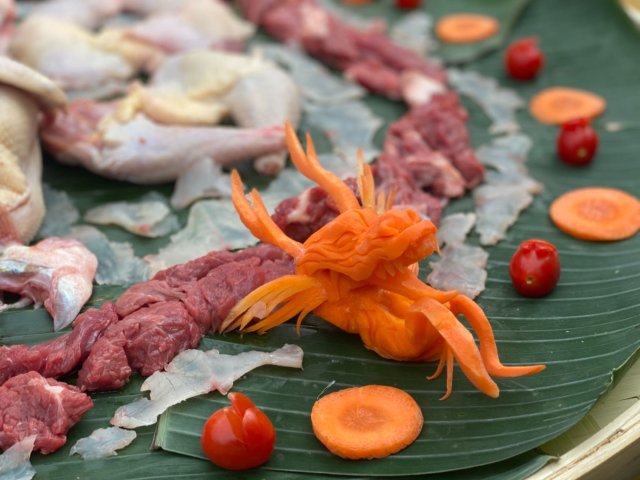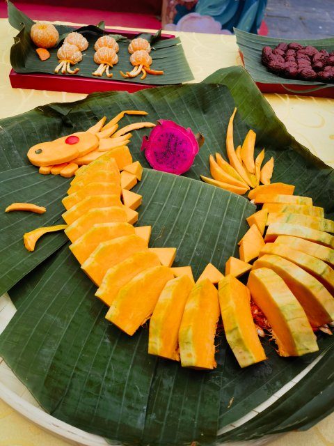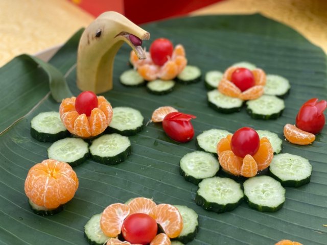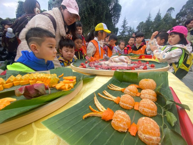 在工作人员和龙年生肖官的通力合作下,五颜六色的蔬菜水果经过精心摆盘,塑造出一条栩栩如生的龙。再加上芭蕉叶的衬托,一份份充满云南本土特色的动物年夜饭惊艳亮相。