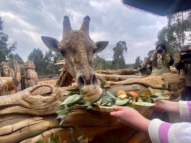 紧接着来到长颈鹿平台,长颈鹿对这份年夜饭十分满意,一眨眼的工夫,就将满满一盘的“树叶手抓饭”吃得干干净净。