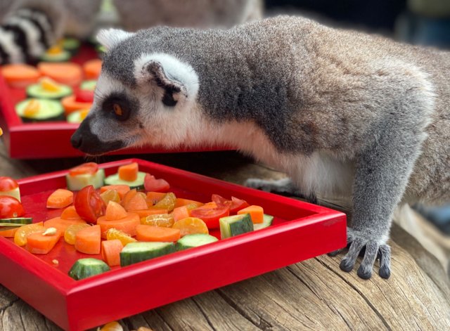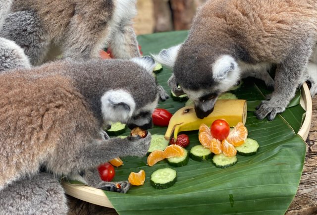 龙年生肖官带着制作好的食物,前往了送餐的第一站,环尾狐猴。把它们最爱吃的香蕉、红枣、苹果、柑橘等制作的手抓饭送到了狐猴乐园,狐猴们围坐一团尽情享受着属于自己的年夜饭。看到动物享受着年夜饭,游客们也看得开心。