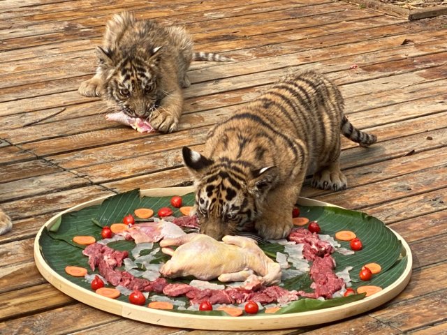 最后一站,来到了狮虎山庄,满满一盘的肉,送给今年刚出生的小老虎。小老虎们断奶后,都是由“奶爸”将剁碎的肉喂给它们。这次面对整只的鸡和各式各样的肉,它们好奇地上前,闻了闻,一只小老虎尝试着叼起一块鸡腿慢慢咀嚼。