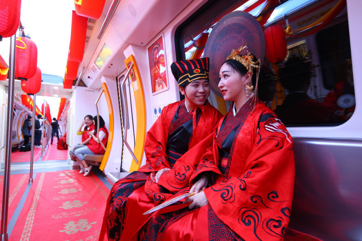浙江宁波,新人乘坐轨道交通3号线列车。图源:视觉中国