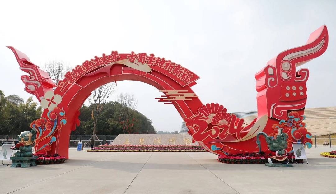 为配合“龙龙”年味,此次三星堆博物馆园区氛围营造以三星堆独有的龙形文物为主元素,搭配多个大型雕塑景观与互动点位供游客打卡留念。博物馆入口处设置了独具设计感的三星堆“龙门”,三星堆出土的龙形象威武庄严、气势磅礴,以昂首盘踞之态喜迎八方来客,为大家祛邪禳灾、祯祥纳福。