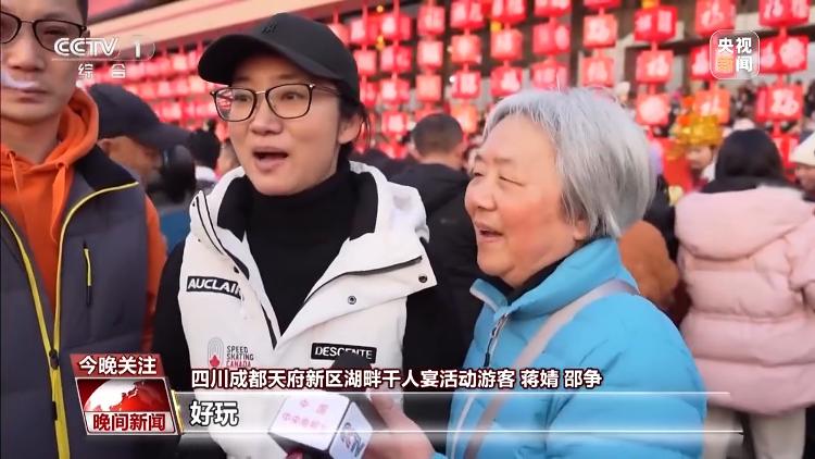 四川成都天府新区湖畔千人宴活动游客蒋婧邵争:我们是外地人,今年第一年在这过年。能感觉到大家安居乐业的气氛,一片祥和,很开心,心情很好。希望我们国家平安,人民能够生活得再好一些。