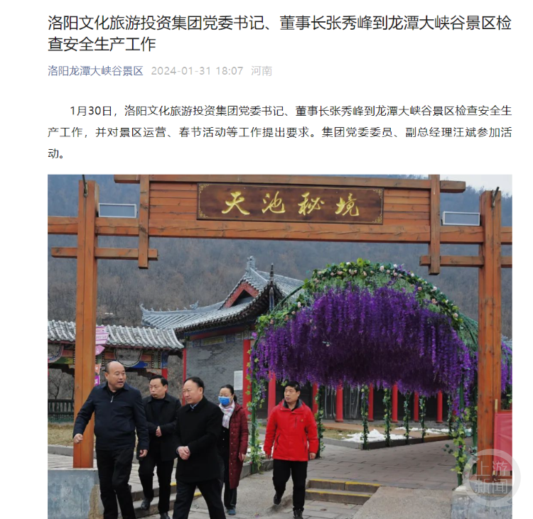 上游新闻记者查看龙潭大峡谷景区微信公众号发现,今年1月30日,洛阳文化旅游投资集团党委书记、董事长张秀峰到龙潭大峡谷景区检查了安全生产工作,并对景区运营、春节活动等工作提出了要求。