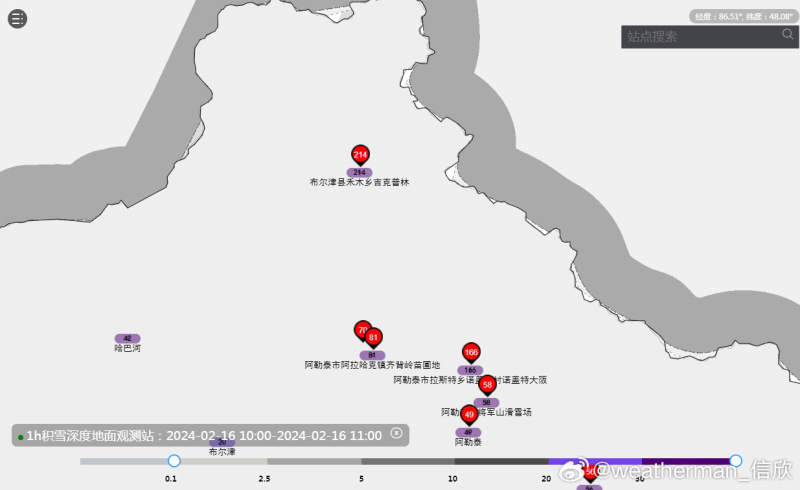 据中国天气网实况天气数据显示,2月15日12时至16日12时,禾木哈纳斯蒙古族乡降水量达56.5毫米,阿勒泰市拉斯特乡降水量37.9毫米,哈巴河县降水量23.2毫米。