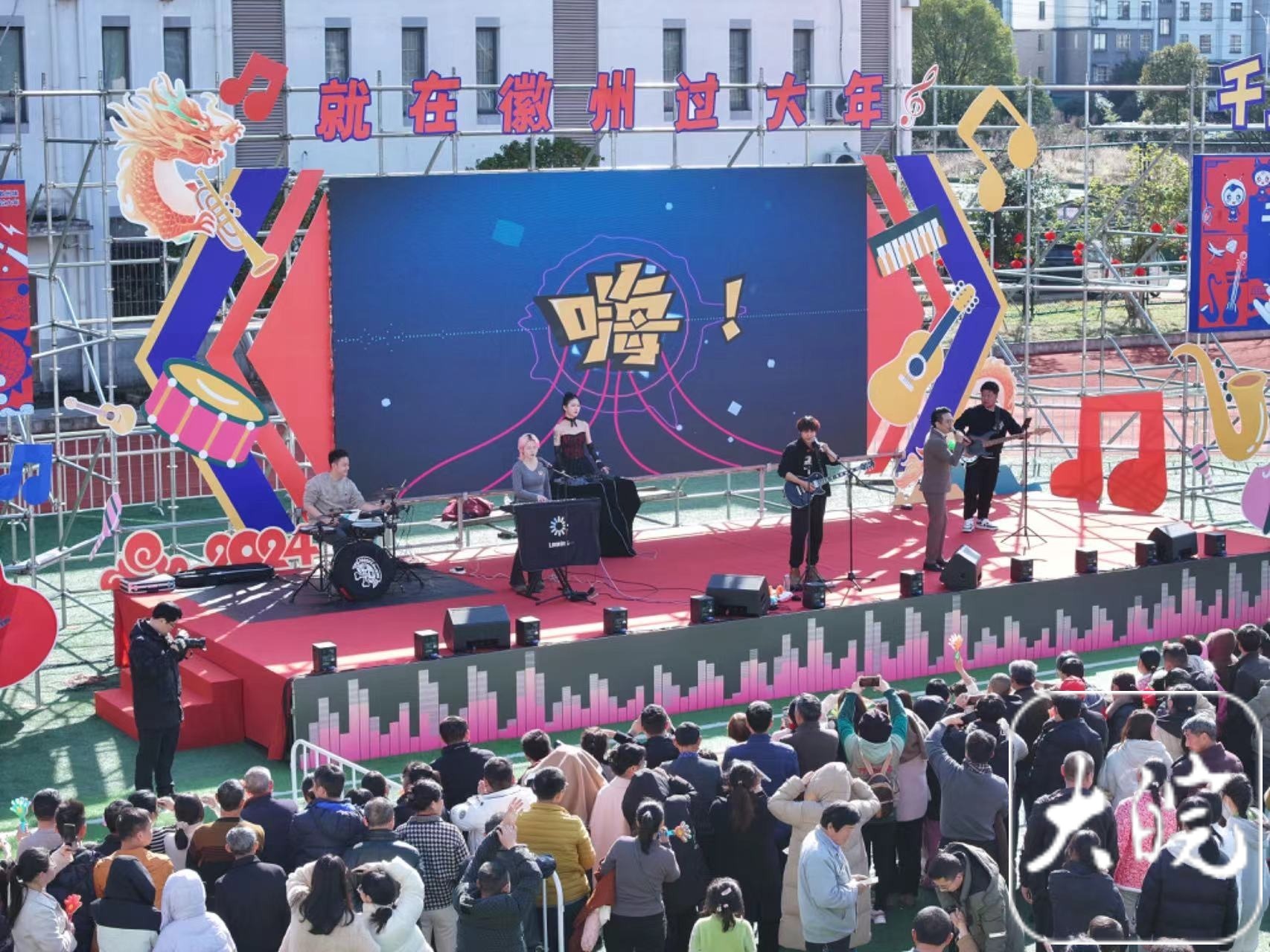 聚·徽州。2月17日,一场大型互动联欢会即将开演,摇滚乐、民谣、舞蹈等多种表演为观众带来视听盛宴,经典舞蹈《兔子舞》和网红舞蹈《科目三》轮番登场,《欢乐中国年》《相亲相爱一家人》等年味歌曲声入人心。