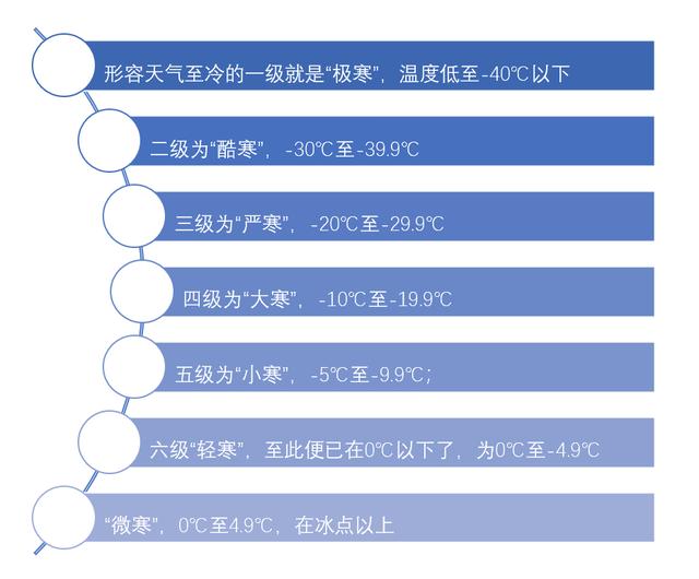 而形容天气至冷的一级就是“极寒”,温度低至-40℃以下。