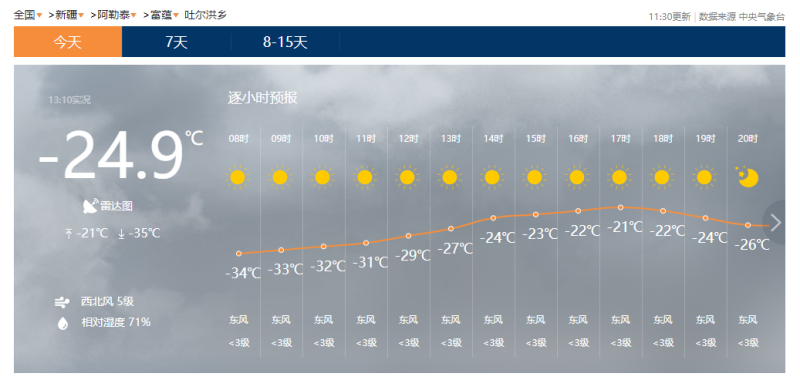 吐尔洪乡距离富蕴县城35公里左右,位于山区中的盆地,冷空气在这里容易堆积难以散去,因此冬天阿勒泰地区的日最低温经常出自这里。