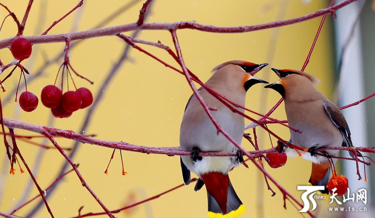 近日,在阿勒泰市一小区内,太平鸟在树林间飞翔,枝头嬉戏、小憩。阿尔达克·拜斯汗摄