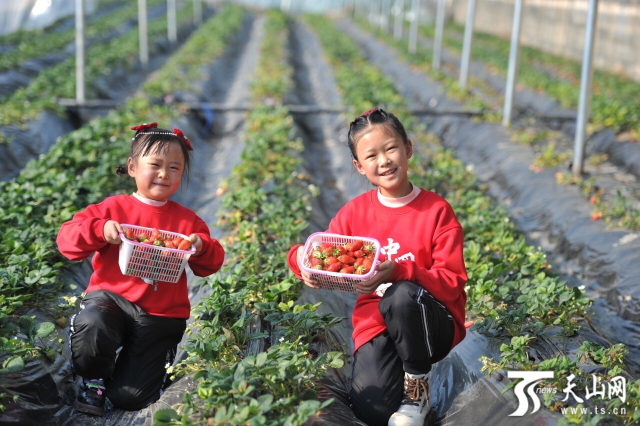 沙湾市西戈壁镇玲珑心草莓采摘园的大棚里,暖意融融,小朋友在展示自己亲手采摘的草莓。天山网-新疆日报记者 秦梅花 摄