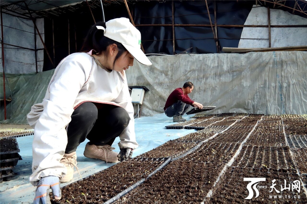 2月15日,职工在新疆生产建设兵团第二师22团4连大棚里摆放已萌芽的辣椒秧苗盘。谢江林摄