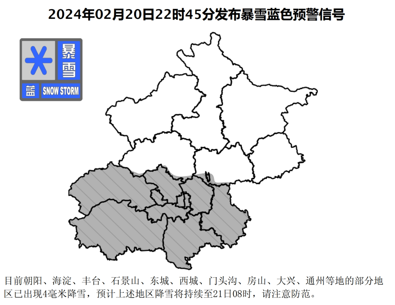 今天22时45分,北京市发布暴雪蓝色预警:目前朝阳、海淀、丰台、石景山、东城、西城、门头沟、房山、大兴、通州等地的部分地区已出现4毫米降雪,预计上述地区降雪将持续至21日8时,请注意防范。