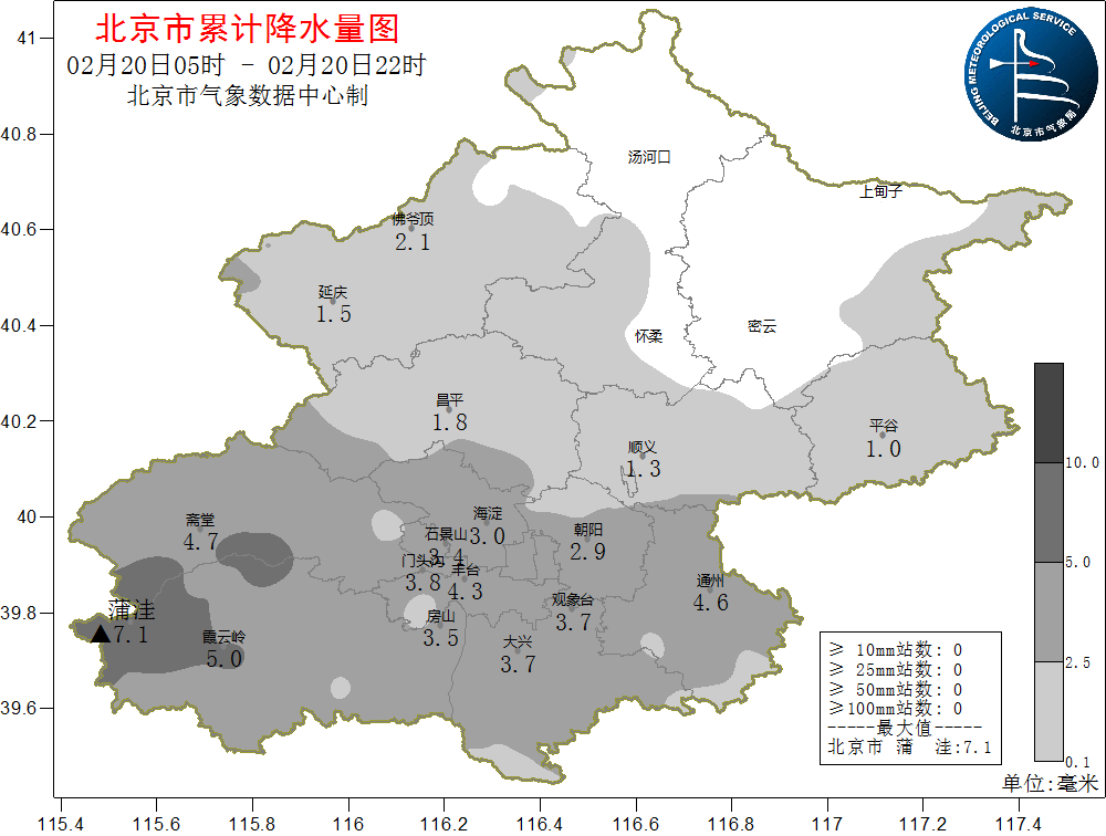 北京市气象台发布20日05时至22时降水量(毫米):全市平均2.7,最大房山蒲洼7.1,最大小时降水强度门头沟东山村2.4毫米/小时(20日21时-22时);城区平均(朝,海,丰,石,东,西)3.5,城区最大丰台鹰山公园5;西北(延,昌)1.4,东北(密,顺,平,怀)0.5,西南(门,房)3.9,东南(通,大)3.6。