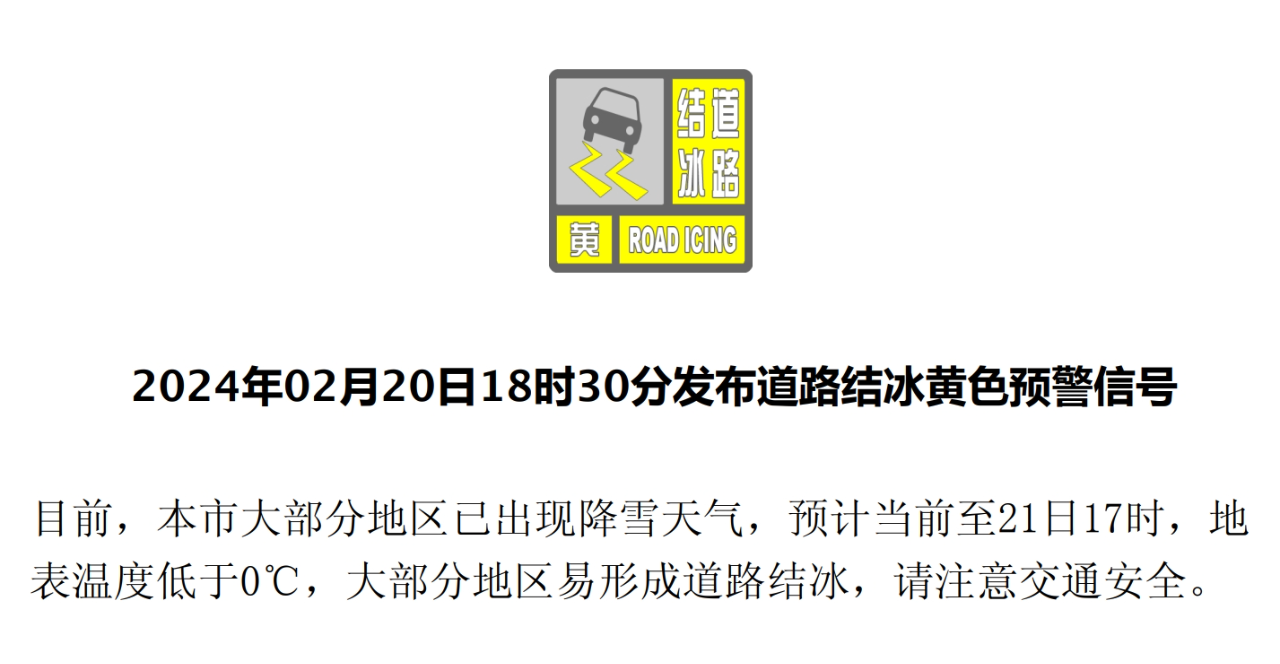 北京市应急局提示:请市民关注天气预报,建议明天(2月21日)错峰出行,倡导乘坐公交、地铁,自行驾驶时减速慢行、注意安全。相关单位做好扫雪铲冰、交通组织,确保水、电、气、热等城市生命线正常安全运行。