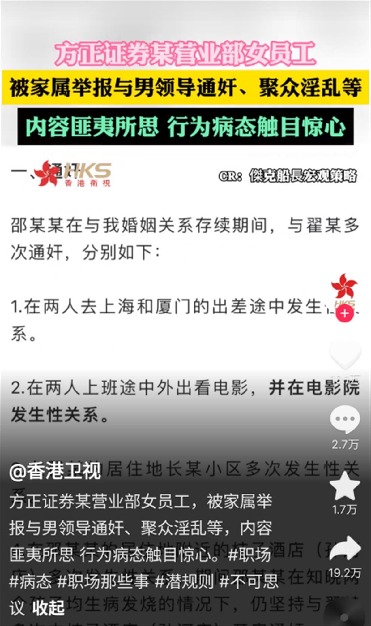 2月21日,一名自称邱某某的男子发文称,他的妻子邵某某系方正证券股份有限公司(简称“方正证券”)某营业部员工,其长期与领导翟某有不正当男女关系,且该领导还存在受贿等违纪违规行为。此外,邱某某还指出,他妻子邵某某与翟某曾多次参与聚众淫乱活动。