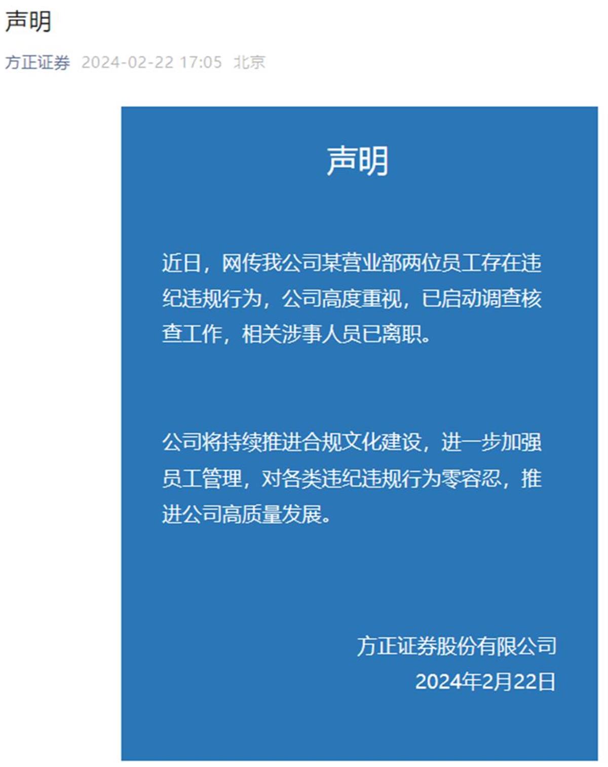 22日下午,方正证券通过官微发布声明称,近日,网传公司某营业部两位员工存在违纪违规行为,公司高度重视,已启动调查核查工作,相关涉事人员已离职。公司将持续推进合规文化建设,进一步加强员工管理,对各类违纪违规行为零容忍,推进公司高质量发展。