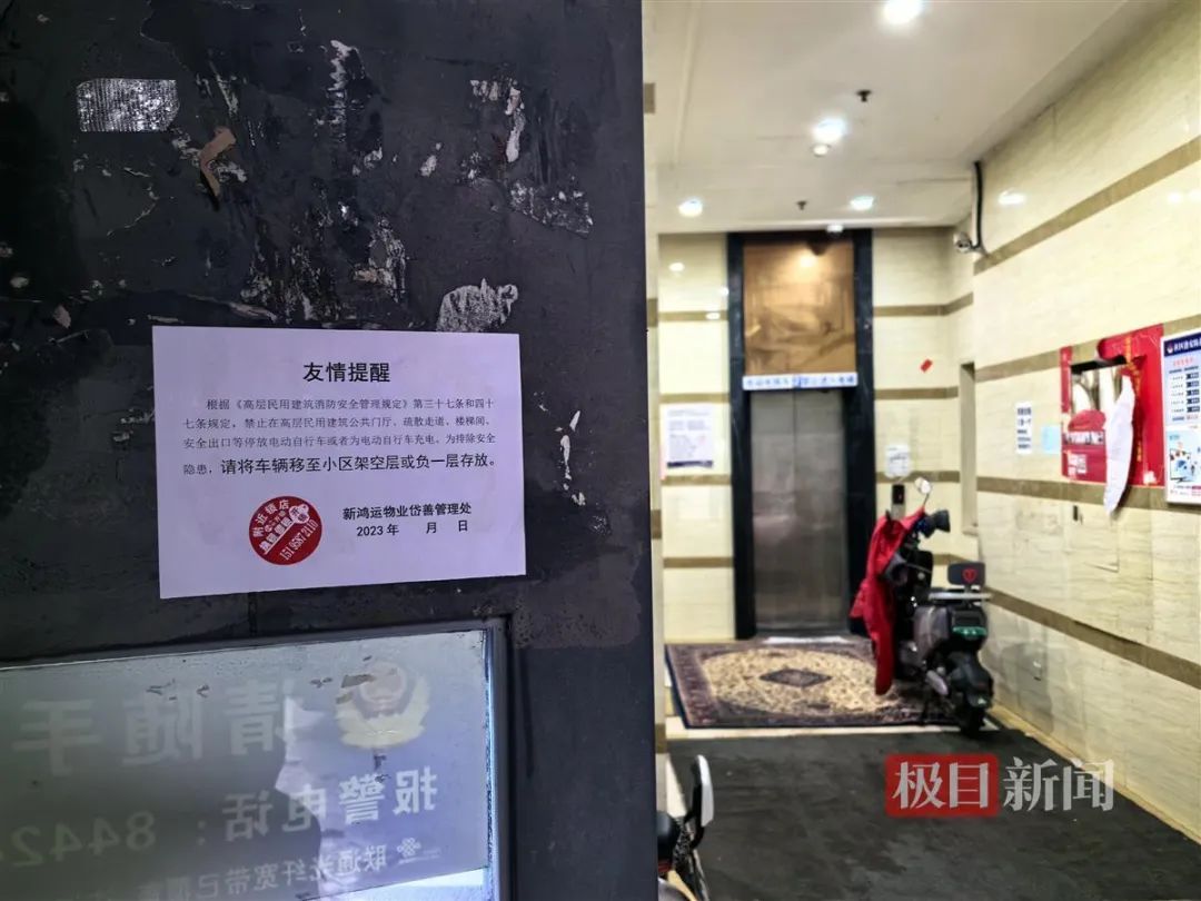失火楼栋相邻楼栋的防火提示与6号楼二单元相邻的5号楼,其一楼是架空层,入户大厅两侧的架空层有电动车充电仪,几乎停满了电动车。入户大厅内贴有较多防范电动自行车火灾隐患的提示,电梯上方贴有“电动电瓶车禁止进入电梯”的标语。入户大厅的一张巡逻签到表显示,巡逻内容为非机动车上楼、电瓶车充电、杂物堆放、灯具照明、消防设施、安全隐患等。
