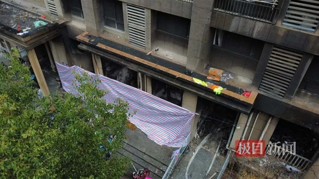 失火的6号楼一楼(航拍画面)23日下午4时许,记者看到失火的6号楼楼下停有两辆消防车,楼外围起了警戒线,有人员值守,外来人员无法进入。记者获取的航拍画面显示,6号楼一楼门口被雨布遮挡,一楼被严重烧毁,内景已无法辨认,只依稀可见两轮或三轮车辆被烧后留下的残骸。