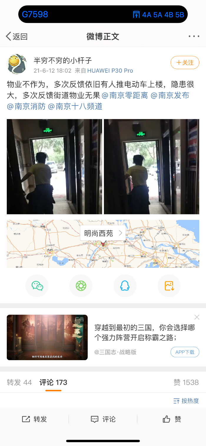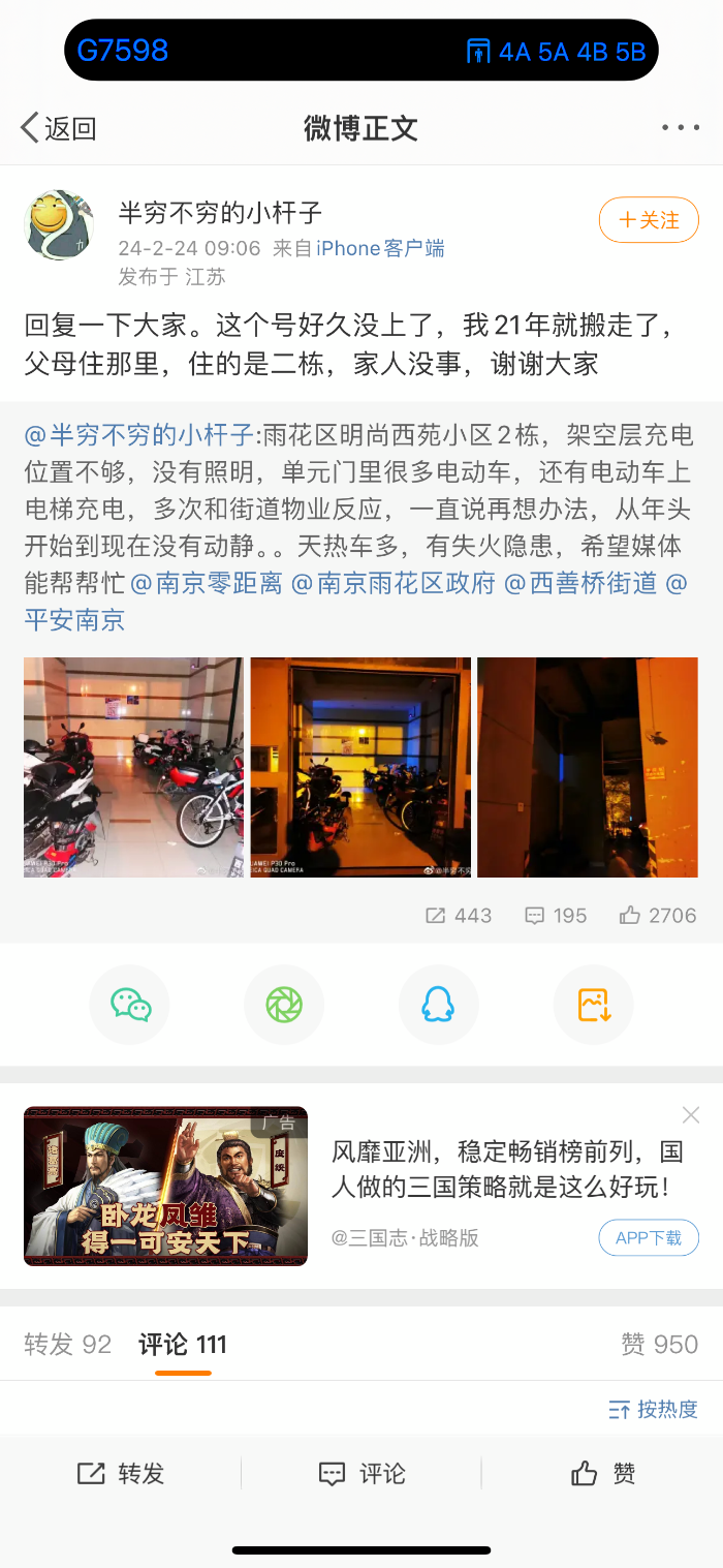 2021年其再次发博称“物业不作为,多次反馈依旧有人推电动车上楼,隐患很大,多次反馈街道物业无果@南京零距离 @南京发布 @南京消防 @南京十八频道 。”此后,该账号一直没有再发微博。