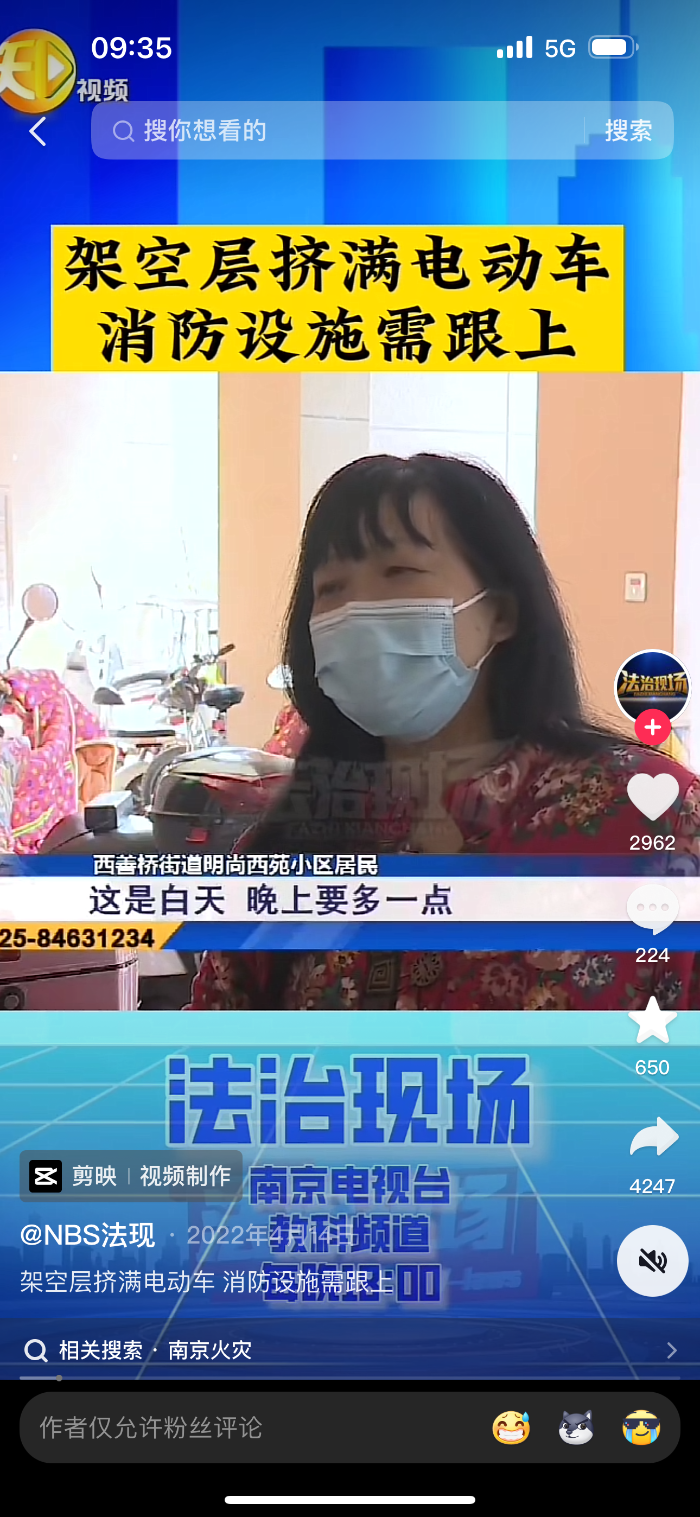 大皖新闻记者注意到,在2022年4月14日,南京广播电视台法治现场栏目抖音号曾推出一期视频报道:南京明尚西苑小区“架空层挤满电动车,消防设施需跟上”,报道中称该小区2019年曾发生火灾,后由于不少居民将电动车停放在架空层,也就是一楼单元门旁的廊道中,存在消防隐患,引发投诉和媒体关注。