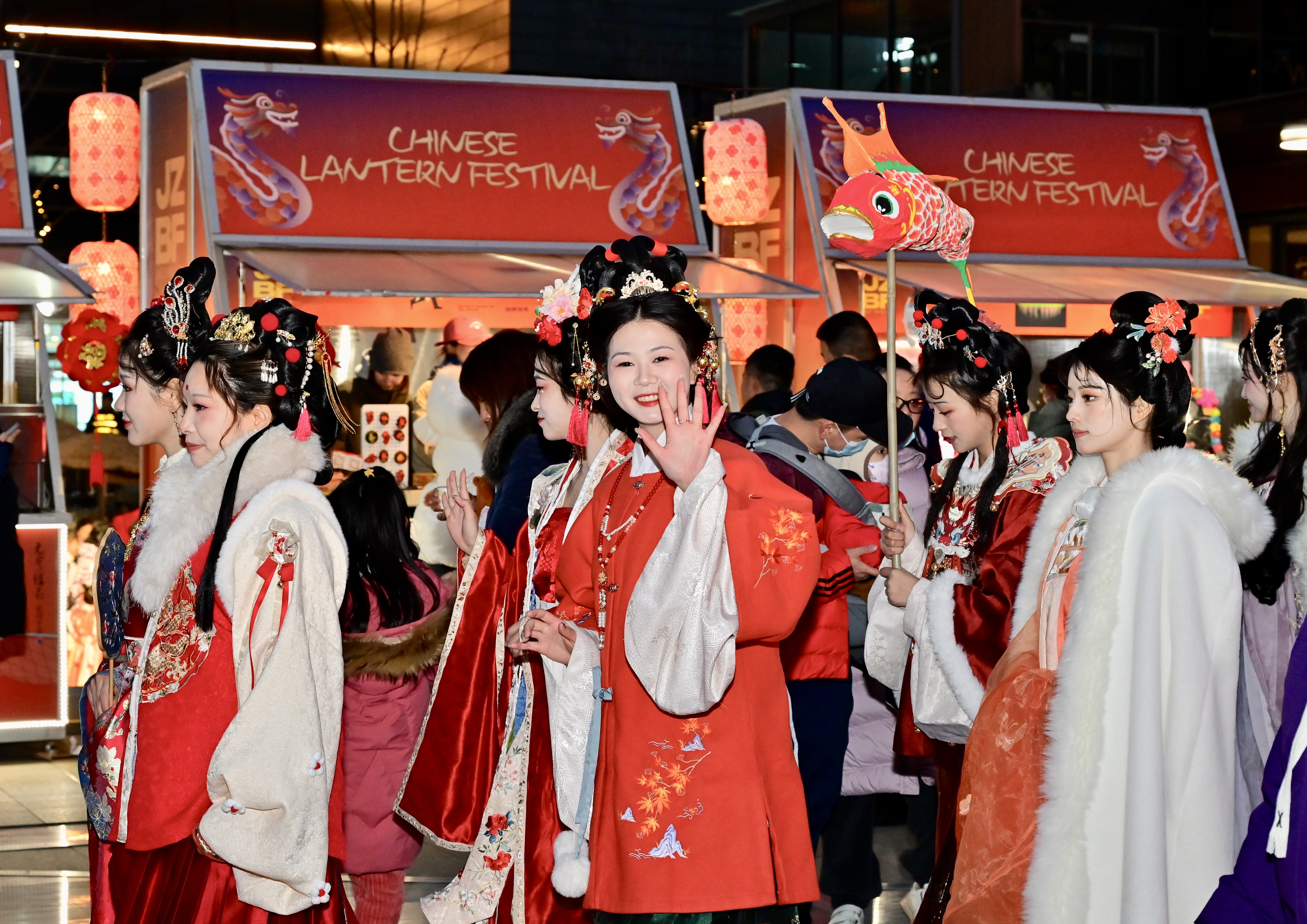 除了吃汤圆,猜灯谜也是元宵节的习俗之一。记者漫步在交子大道时看到,由近百个红灯笼组成的猜灯谜打卡处围满了市民游客。“龙年到来喜气洋洋”,李爷爷与孙女一起猜灯谜,玩得不亦乐乎。“我们一家人都是交子大道的‘常客’,每当节假日有活动时都会前来。现在的活动越来越丰富,热闹好玩。”