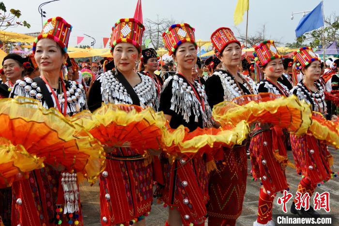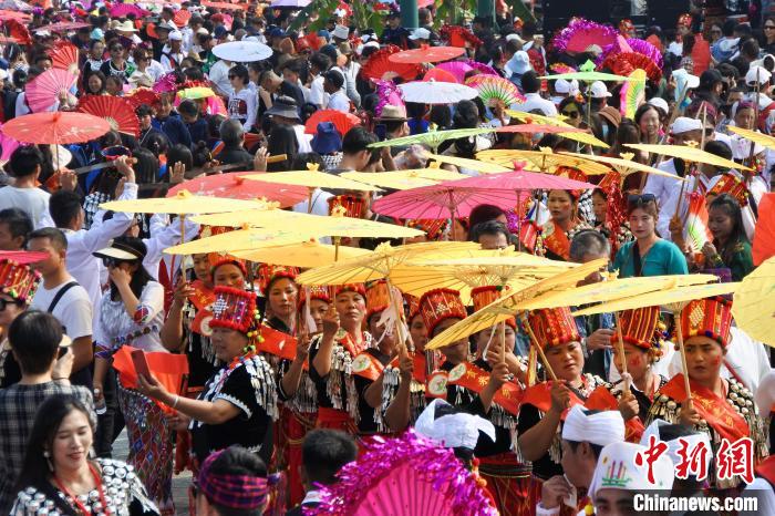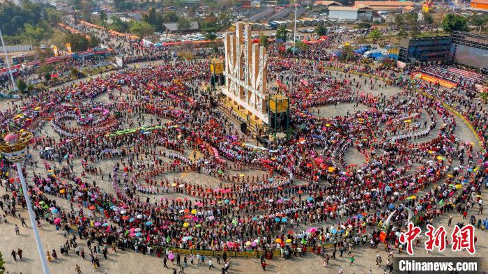 中新网德宏2月24日电(罗婕)24日,正值正月十五元宵节,在云南省德宏傣族景颇族自治州芒市的上万名各族民众身着盛装踏着同一个鼓点起舞,欢庆一年一度的目瑙纵歌节。