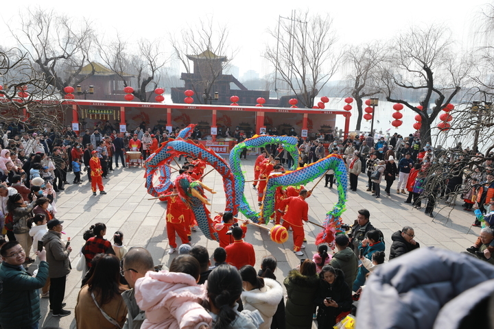 元宵佳节,月圆人团圆,大明湖畔更是一派热闹非凡的景象。为了庆祝这一传统节日,济南文旅集团特别策划了一系列精彩纷呈的民俗互动表演活动,包括舞龙舞狮、踩高跷等,让游客们沉浸在浓厚的节日氛围中,共度元宵佳节。