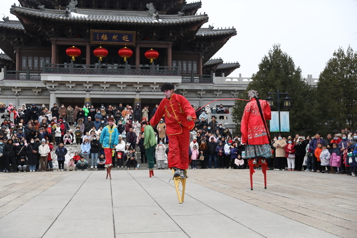 与此同时,另一边的高跷表演也吸引了众多游客的目光。身着传统服饰的演员们踩着高高的木跷,在舞台上翩翩起舞,展现出高超的技艺和优美的舞姿,观众们纷纷为他们精湛的技艺和敬业的精神鼓掌喝彩。踩高跷作为一种古老的艺术形式,不仅展示了中华文化的多样性,也为元宵佳节增添了更多的欢乐和喜庆。