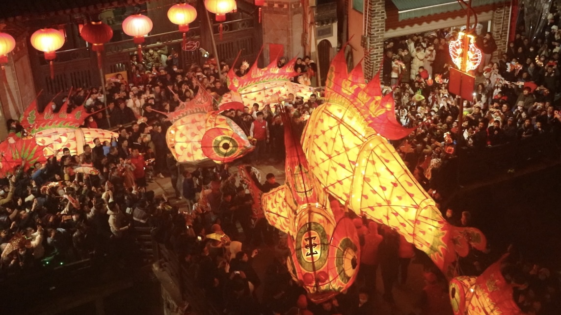 澎湃新闻获悉,今年,汪满田鱼灯节于正月十三至十六在溪头镇汪满田村举办,估算超9000人到场观看,全村5个鱼会共出鱼十余条,最大的鱼长达9米。