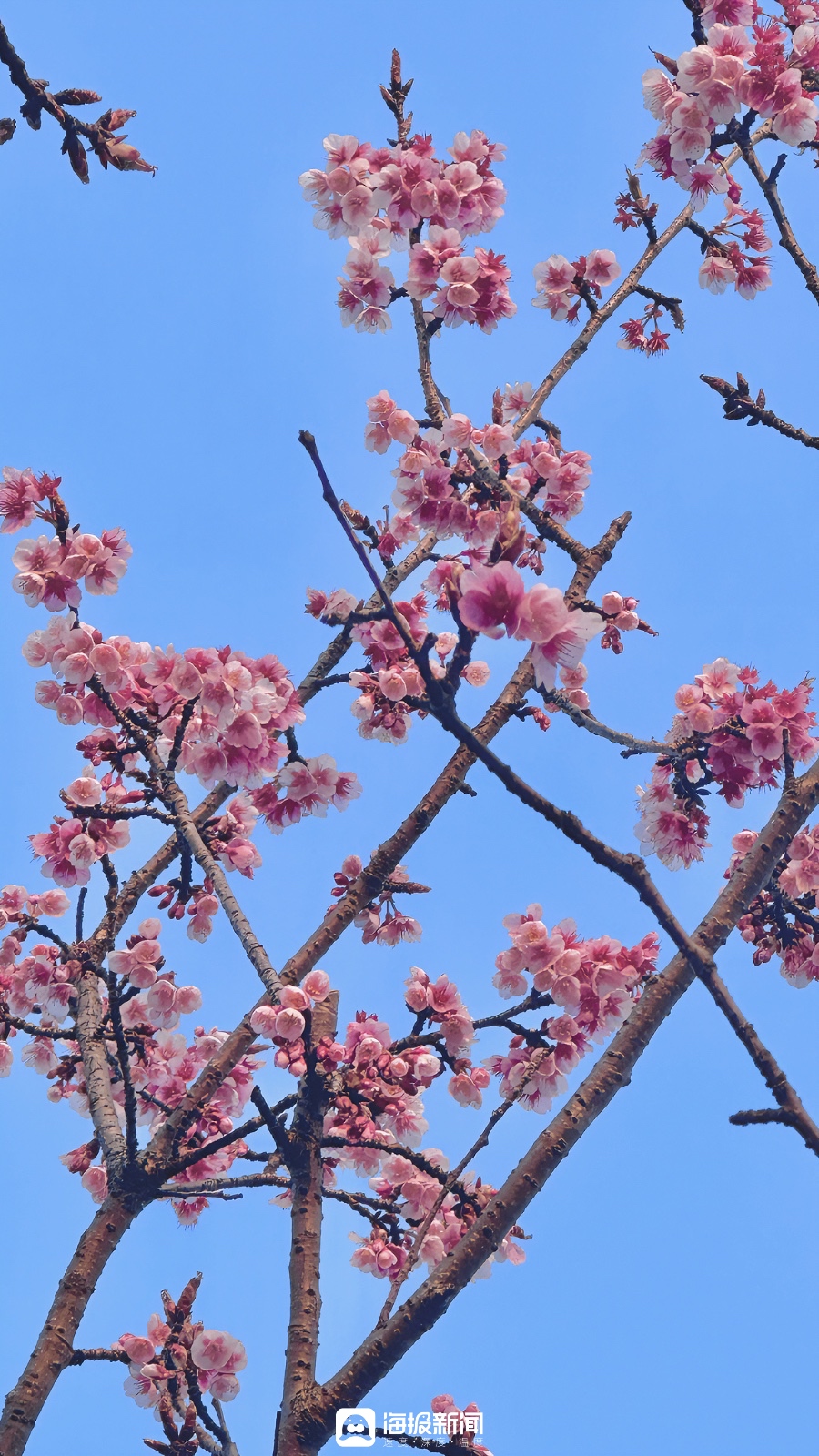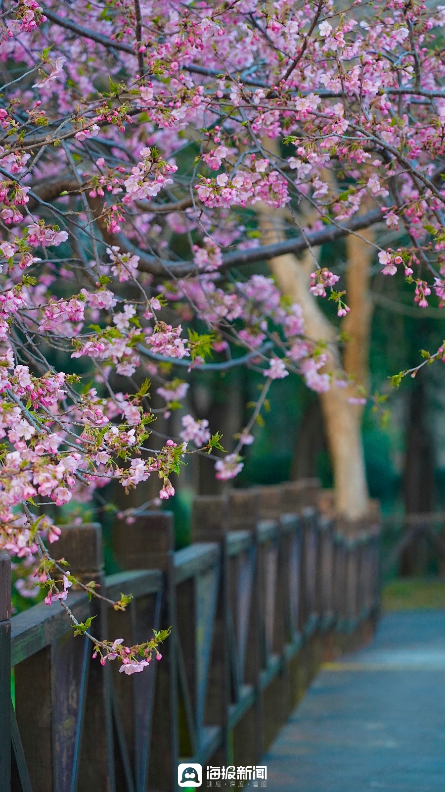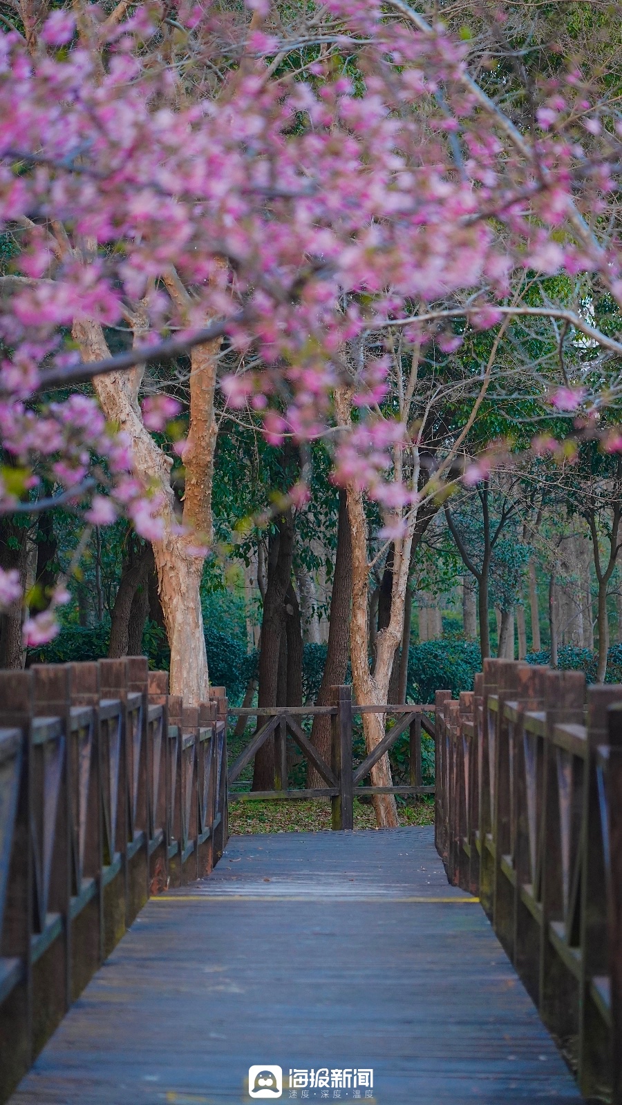 除2号门旁的赏樱处,顾村公园内的郊野森林赏樱区也布满粉色“云朵”,幽幽的小路旁绽放着几棵河津樱,如同精灵般在枝头跳跃,为早春增添了一抹生机与活力。