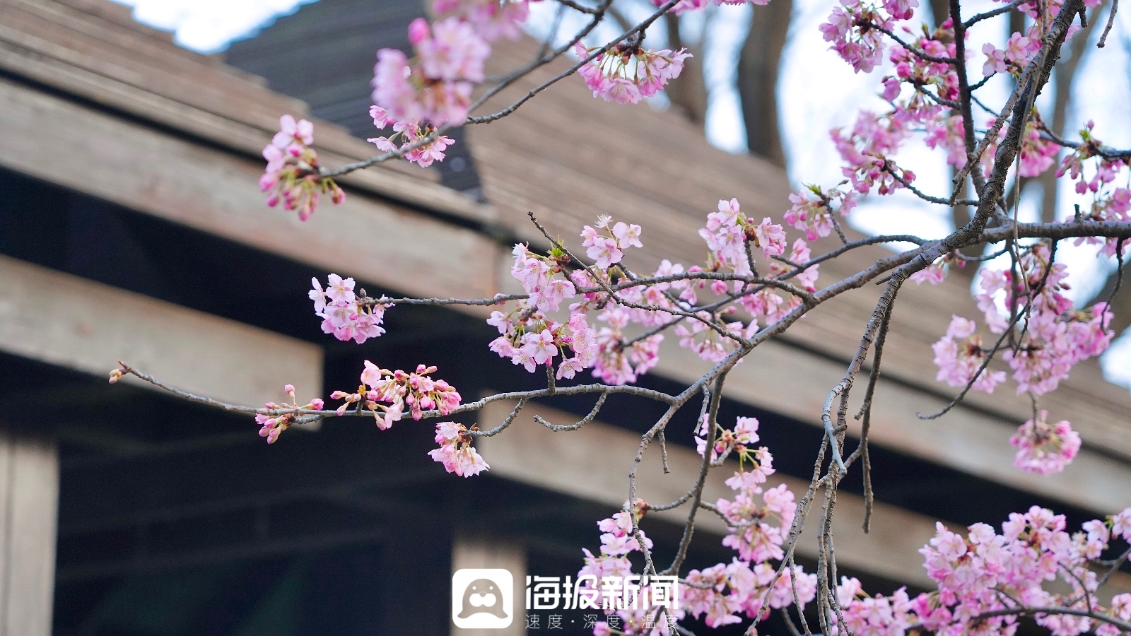 刚进入2号门,可以看到几棵盛开的河津樱与钟花樱,它们都是早樱中花期较早的品种。乍暖还寒的天气里,河津樱已进入初花期。同样盛放的还有钟花樱,花朵如一朵朵的绯色小蓬裙,三五朵成簇,它的花苞如同小吊钟。