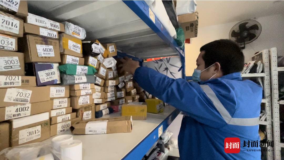 2月29日中午12点30分,成都温江区大学城附近一家菜鸟驿站里,负责人何城正在整理送到驿站的300多份快件,大大小小的快递摆满了货架,一旁还有几位用户前来取件。