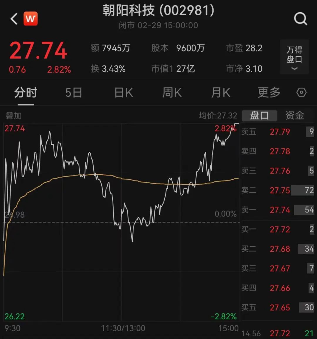 截至2月29日收盘,朝阳科技报收27.74元/股,上涨2.82%,总市值26.63亿元。