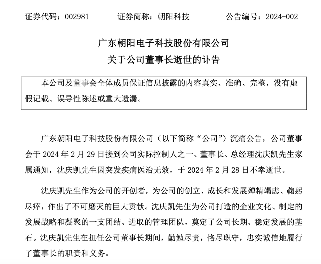 2月29日下午,朝阳科技(002981)发布讣告:公司实际控制人之一、董事长、总经理沈庆凯因突发疾病医治无效,于2024年2月28日不幸逝世。