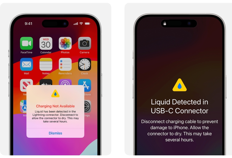 上述文档指出,首先从iPhone上拔下线缆,然后从电源适配器或配件上拔下线缆的另一端。在iPhone和线缆完全干燥之前,不要再次插接线缆。
