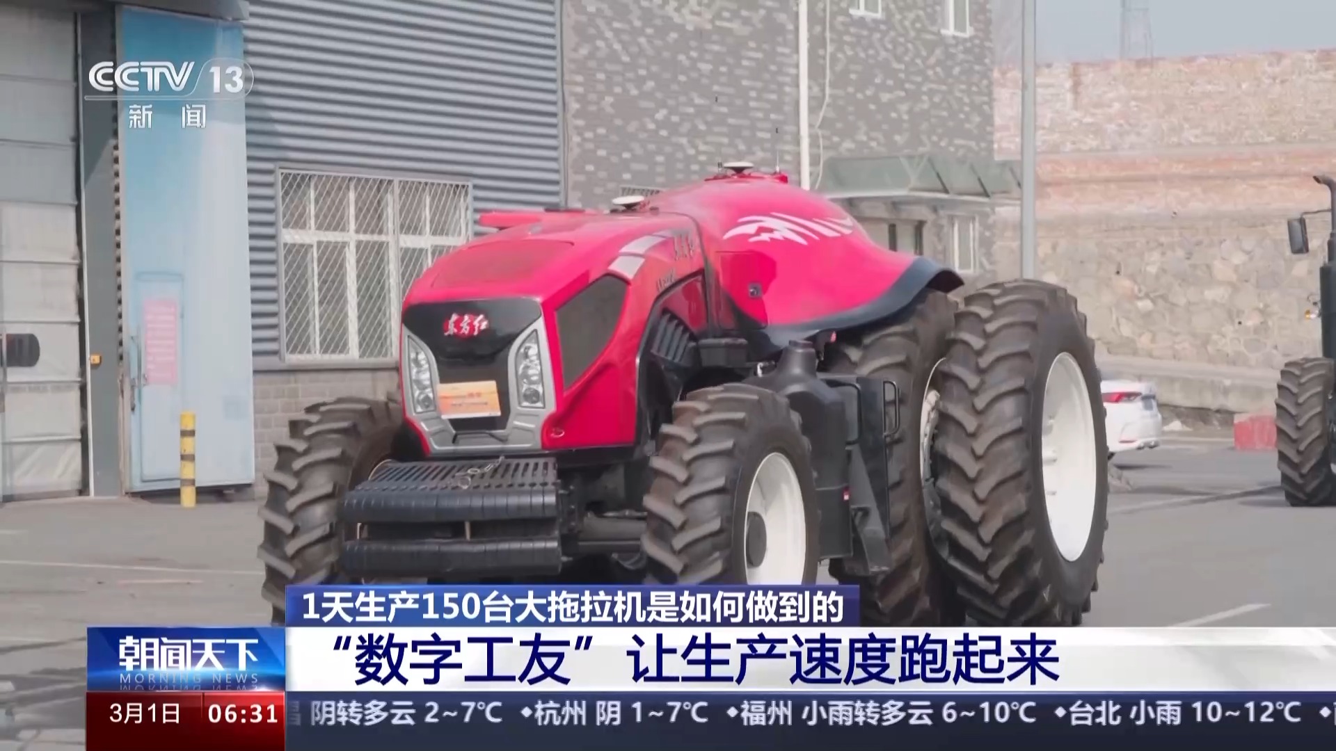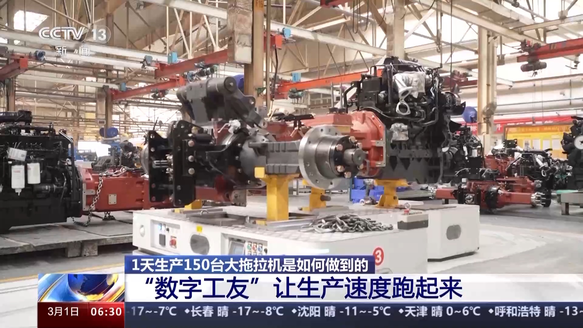 总台央视记者 蒋树林:根据我刚才的现场观察,我发现不到3分钟,就有一台拖拉机从生产线开出来,按照这样的速度,一天工作时间中,就能生产150台甚至200台的大拖拉机,而这样的速度的背后,是数字化和智能化装备的加持。