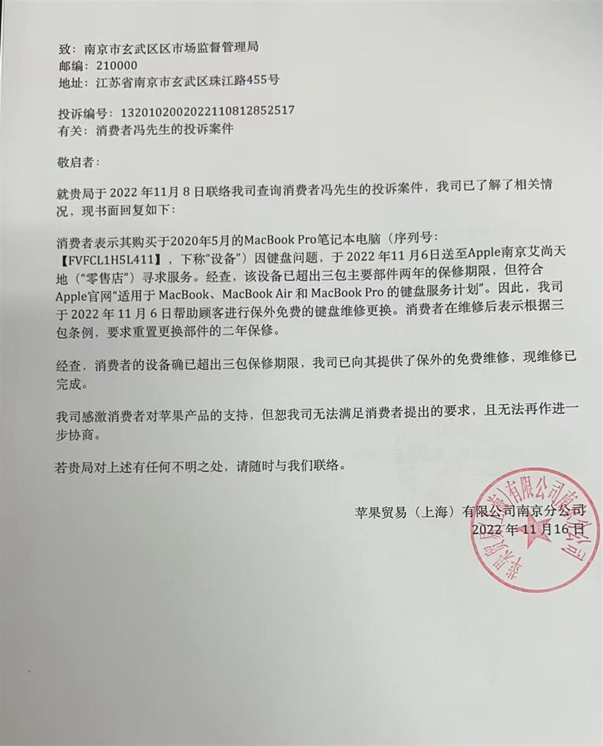 苹果南京分公司对冯先生的投诉,向当地市场监管局作出了书面答复